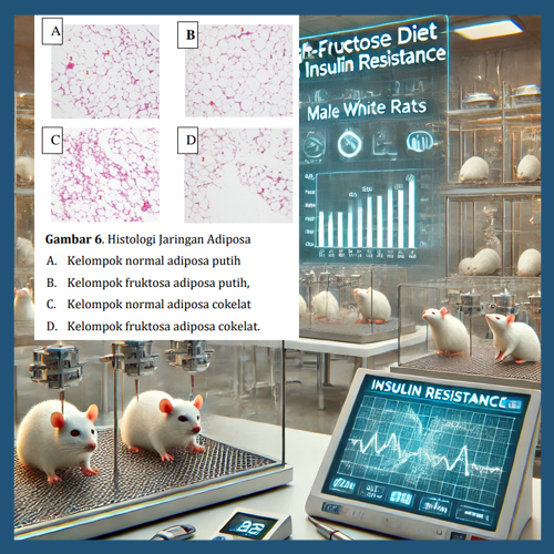 High fructose intake can cause metabolic disturbances leading to the onset of metabolic syndrome and type 2 diabetes mellitus. This study will present some of the effects of fructose consumption. This study aims to model the animal test by giving 60% fructose to insulin resistance. The research method used 8 male white rats of Wistar strain which were grouped into 2 groups, namely normal group and 60% fructose group. Parameters observed on body weight, blood glucose levels, Insulin Tolerance Test Constant (ITTC), adiponectin levels and TNF-α levels and adipose tissue histology. The results showed that the administration of 60% fructose for 60 days showed a difference for blood glucose levels starting on days 30-60, ITTC values of the fructose group were smaller than the normal group, adiponectin levels of the fructose group were smaller than the normal group, while TNF-α levels of the fructose group were greater than the normal group and there was an enlargement of the diameter of white adipose tissue and a reduction in brown adipose in the fructose group, but there was no difference in body weight. It can be concluded that the administration of 60% fructose for 60 days can be used as modeling of insulin resistance test animals.