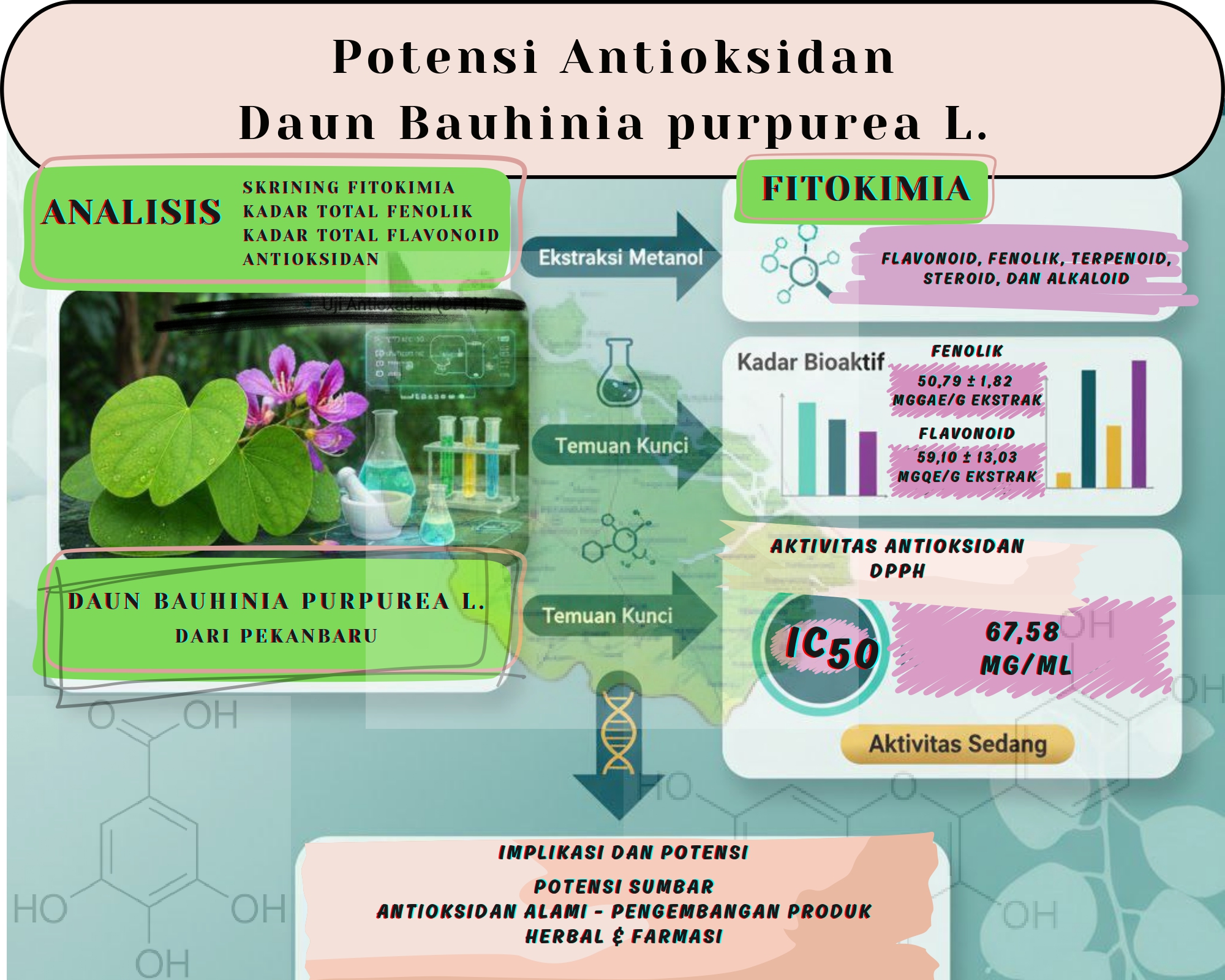 Antioxidants are important bioactive compounds that play a key role in neutralizing free radicals and preventing oxidative damage to cells. Bauhinia purpurea L., locally known as butterfly tree leaves, has been reported to contain various phenolic and flavonoid compounds with promising antioxidant potential. This study aimed to evaluate the phytochemical content and antioxidant activity of methanolic extract of Bauhinia purpurea L. leaves collected from Pekanbaru. Phytochemical screening revealed the presence of flavonoids, phenolics, terpenoids, steroids, and alkaloids. The total phenolic and flavonoid contents were 50.79 ± 1.82 mg GAE/g and 59.10 ± 13.03 mg QE/g extract, respectively. Antioxidant activity measured by the DPPH method showed an IC₅₀ value of 67.58 µg/mL, indicating moderate antioxidant potential. These results suggest that Bauhinia purpurea leaves from Pekanbaru have potential as a natural antioxidant source for herbal and pharmaceutical product development. Geographic factors and extraction methods play a significant role in determining the bioactive content and antioxidant activity of the extract.