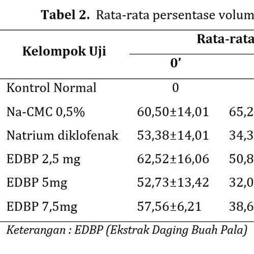 Inflammation is a defence reaction of the body to eliminate factors that can damage and then rebuild the body's homeostasis. Synthetic anti-inflammatory drugs are known to cause many side effects. Therefore, the research for new drugs from nature is carried out, generally sourced from natural ingredients. One of the natural ingredients that has potential as an anti-inflammatory is nutmeg flesh (Myristica fragrans Houtt.). This study aimed to determine the anti-inflammatory activity of nutmeg flesh ethanol extract (EDBP) in carrageenan-induced paw edema models in Wistar albino rats. This study is an experimental study using 30 Wistar albino rats that were randomly divided into six treatment groups which included a negative control group (Sodium CMC), a positive control group (diclofenac sodium 0.9mg/200gBW of rats), and three levels of ethanol extract of nutmeg flesh: 2.5mg/200gBW, 5mg/200gBW and 7.5mg/200gBW administered orally. One hour after the treatment, the rats were injected with 0.1 ml Carrageenan 1% sub plantar. The edema volume was measured with a plethysmometer every 30 minutes for 3 hours. Anti-inflammatory activity was measured by comparing the percentage of inflammatory protection. The data were then analysed using one-way ANOVA to compare the anti-inflammatory activity between the treatment and the control groups. The results showed that EDBP 2.5mg, 5mg, and 7.5mg gave significantly different effects compared to the control group (p<0.05), where EDBP 7.5 mg showed the highest anti-inflammatory activity.